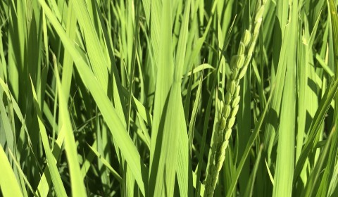 ちょっとわかりにくい写真ですが、酒造好適米の夢の香の穂が出ました。 毎日暑い日が続き、はやめの出穂です。 伊南川の水位が下がって、出穂の大切な時期に水が足りません。